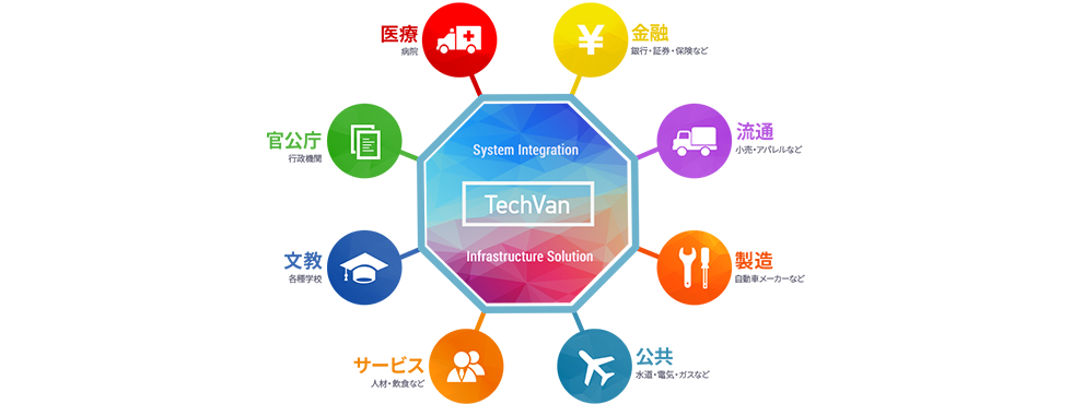 テクバンがご提供するシステム開発サービスは、銀行、証券、生損保業を支える金融系、官公庁や公共事業を支える公共システム系から、日常生活で欠かせないネット通販業を支える在庫管理・販売管理に特化した流通系システムなど、多岐にわたります。長年培ってきたノウハウと、経験・実績豊富なエンジニアがお客様のありとあらゆるニーズにお答えするシステムを開発・構築いたします。ご提供可能なシステムはパッケージソフトに限らず、お客様のご要望にあわせてオーダーメイド開発することも可能です。お客様の業務効率の向上を第一に考えるテクバンだからこそできるサービスです。