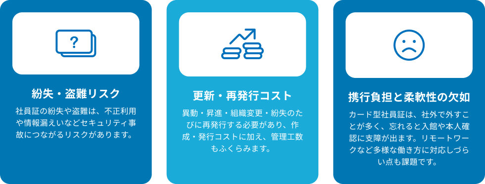 アナログ社員証が抱える「紛失リスク」「更新コスト」「運用負荷」を解消し、社員の利便性向上とセキュリティ強化を同時に実現します。